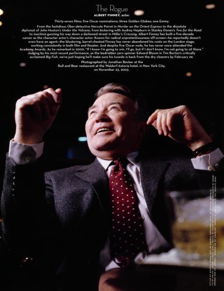 From the fastidious Über-detective Hercule Poirot in Murder on the Orient Express to the dissolute diplomat of John Huston’s Under the Volcano, from bickering with Audrey Hepburn in Stanley Donen's Two for the Road to machine-gunning his way down a darkened street in Miller's Crossing, Albert Finney has built a five-decade career as the character actor's character actor. Known for radical unpretentiousness off-screen—he reportedly doesn’t even have an agent—the blustering, barrel-chested Finney has never abandoned his roots on the London stage, working consistently in both film and theater. And despite five Oscar nods, he has never once attended the Academy Awards. As he remarked in 2000, "If I know I'm going to win, I’ll go, but if I don’t know, I’m not going to sit there.” Judging by his most recent performance, as the bedridden yarn spinner Edward Bloom in Tim Burton’s critically acclaimed Big Fish, we’re just hoping he’ll make sure his tuxedo is back from the dry cleaners by February 29.