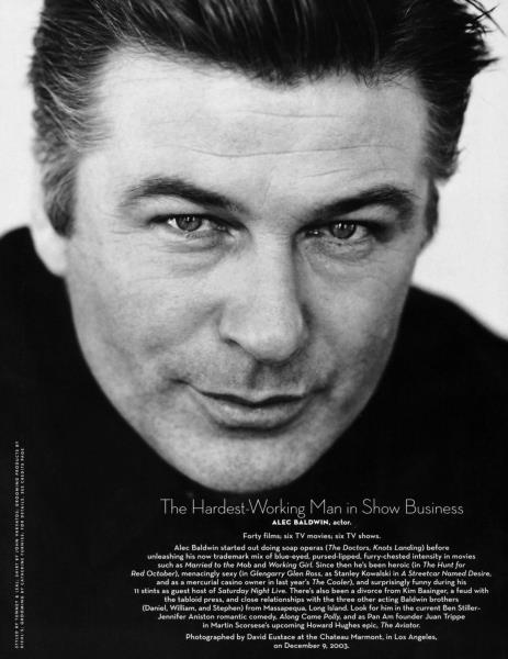 Alec Baldwin started out doing soap operas (The Doctors, Knots Landing) before unleashing his now trademark mix of blue-eyed, pursed-lipped, furry-chested intensity in movies such as Married to the Mob and Working Girl. Since then he’s been heroic (in The Hunt for Red October), menacingly sexy (in Glengarry Glen Ross, as Stanley Kowalski in A Streetcar Named Desire, and as a mercurial casino owner in last year’s The Cooler), and surprisingly funny during his 11 stints as guest host of Saturday Night Live. There’s also been a divorce from Kim Basinger, a feud with the tabloid press, and close relationships with the three other acting Baldwin brothers (Daniel, William, and Stephen) from Massapequa, Long Island. Look for him in the current Ben Stiller-Jennifer Aniston romantic comedy, Along Came Polly, and as Pan Am founder Juan Trippe in Martin Scorsese’s upcoming Howard Hughes epic, The Aviator.