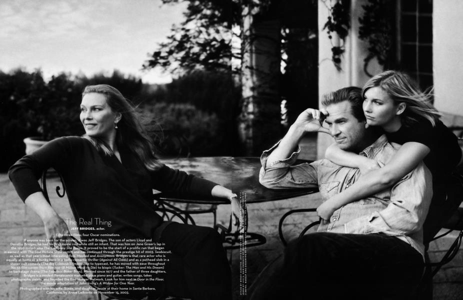 If anyone was born for the screen, it was Jeff Bridges. The son of actors Lloyd and Dorothy Bridges, he had his first movie role while still an infant. That was him on Jane Greer’s lap in the 1950 melodrama The Company She Keeps. It proved to be the start of a prolific run that began in earnest with The Last Picture Show in 1971 and has continued through the prestige hit of 2003, Seabiscuit, as well as that year’s most interesting flop, Masked and Anonymous. Bridges is that rare actor who is equally at home as a hunky hero in a boffo romantic thriller (Against All Odds) and as a pothead slob in a stoner cult comedy (The Big Lebowski). Impossible to typecast, he has moved with ease throughout his 53-film career from film noir (8 Million Ways to Die) to biopic (Tucker: The Man and His Dream) to backstage drama (The Fabulous Baker Boys). Married since 1977 and the father of three daughters, Bridges is a modest Renaissance man who plays piano and guitar, writes songs, takes photographs, paints, and founded the End Hunger Network. Look for him next in Door in the Floor, the movie adaptation of John Irving’s A Widow for One Year.