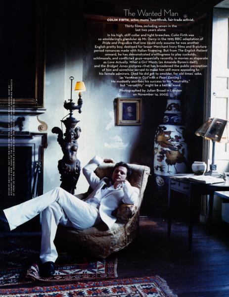 In his high, stiff collar and tight breeches, Colin Firth was so smolderingly glandular as Mr. Darcy in the 1995 BBC adaptation of Pride and Prejudice that one could only assume he was another English pretty boy, destined for lesser Merchant Ivory films and B-picture period romances made with Italian financing. But from The English Patient onward, he has demonstrated a willingness to play cuckolds, schlimazels, and conflicted guys—especially recently, in movies as disparate as Love Actually, What a Girl Wants (as Amanda Bynes’s dad!), and the Bridget Jones pictures—that has broadened the public perception of him and somehow served to make him still more appealing to his female admirers. (And he did get to smolder, for old times’ sake, as Vermeer in Girl with a Pearl Earring.) He modestly ascribes his success to his "neutrality," versatility” might be a better word.