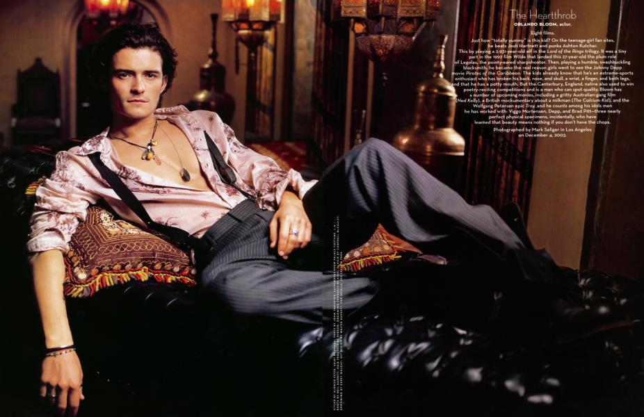 Just how “totally yummy" is this kid? On the teenage-girl fan sites, he beats Josh Hartnett and punks Ashton Kutcher. This by playing a 2,931-year-old elf in the Lord of the Rings trilogy. It was a tiny part in the 1997 film Wilde that landed this 27-year-old the plum role of Legolas, the pointy-eared sharpshooter. Then, playing a humble, swashbuckling blacksmith, he became the real reason girls went to see the Johnny Depp movie Pirates of the Caribbean. The kids already know that he’s an extreme-sports enthusiast who has broken his back, nose, and skull, a wrist, a finger, and both legs, and that he has a potty mouth. But the Canterbury, England, native also used to win poetry-reciting competitions and is a man who can spot quality. Bloom has a number of upcoming movies, including a gritty Australian-gang film Ned Kelly, a British mockumentary about a milkman (The Calcium Kid), and the Wolfgang Petersen epic Troy, and he counts among his idols men he has worked with: Viggo Mortensen, Depp, and Brad Pitt—three nearly perfect physical specimens, incidentally, who have learned that beauty means nothing if you don’t have the chops.