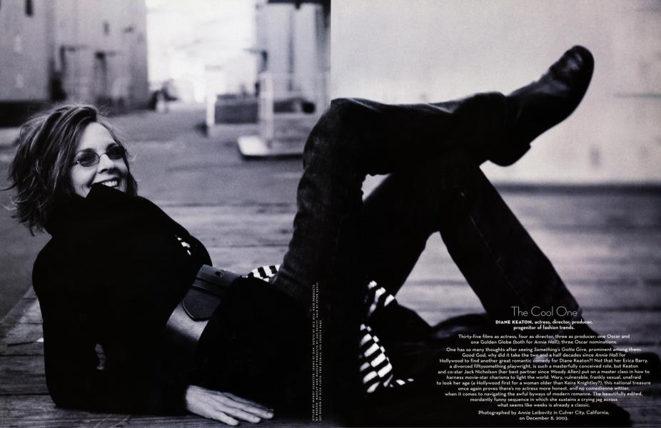 One has so many thoughts after seeing Something's Gotta Give, prominent among them: Good God, why did it take the two and a half decades since Annie Hall for Hollywood to find another great romantic comedy for Diane Keaton?! Not that her Erica Barry, a divorced fifty-something playwright, is such a masterfully conceived role, but Keaton and co-star Jack Nicholson (her best partner since Woody Allen) put on a master class in how to harness movie-star charisma to light the world. Wary, vulnerable, frankly sexual, unafraid to look her age (a Hollywood first for a woman older than Keira Knightley?), this national treasure once again proves there's no actress more honest, and no comedienne wittier, when it comes to navigating the awful byways of modern romance. The beautifully edited, mordantly funny sequence in which she sustains a crying jag across what seems like weeks is already a classic.