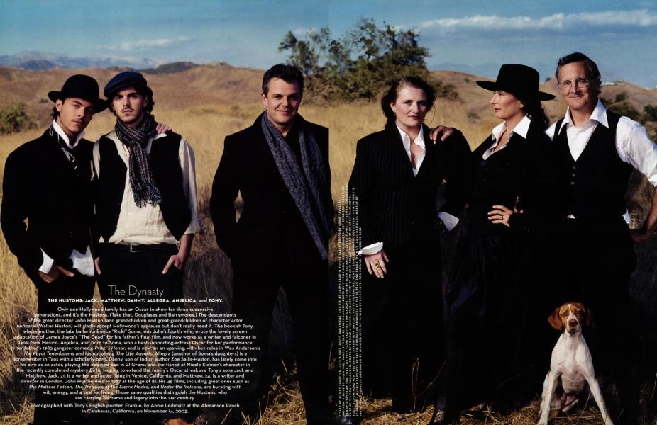 Only one Hollywood family has an Oscar to show for three successive generations, and it’s the Hustons. (Take that, Douglases and Barrymores.) The descendants of the great director John Huston (and grandchildren and great-grandchildren of character actor nonpareil Walter Huston) will gladly accept Hollywood’s applause but don’t really need it. The bookish Tony, whose mother, the late ballerina Enrica “Ricki” Soma, was John’s fourth wife, wrote the lovely screen adaptation of James Joyce’s "The Dead” for his father’s final film, and now works as a writer and falconer in Taos, New Mexico. Anjelica, also born to Soma, won a best-supporting-actress Oscar for her performance in her father's 1985 gangster comedy, Prizzi’s Honor, and is now on an upswing, with key roles in Wes Anderson’s The Royal Tenenbaums and his upcoming The Life Aquatic. Allegra (another of Soma’s daughters) is a screenwriter in Taos with a scholarly bent. Danny, son of Indian author Zoe Sallis-Huston, has lately come into his own as an actor, playing the doomed dad in 21 Grams and the fiancé of Nicole Kidman’s character in the recently completed mystery Birth. Hoping to extend the family's Oscar streak are Tony’s sons Jack and Matthew. Jack, 21, is a writer and actor lining in Venice, California, and Matthew, 24, is a writer and director in London. John Huston died in 1987 at the age of 81. His 45 films, including great ones such as The Maltese Falcon, The Treasure of the Sierra Madre, and Under the Volcano, are bursting with wit, energy, and a zeal for living. Those same qualities distinguish the Hustons, who are carrying his name and legacy into the 21st century.