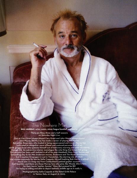 Just as Cary Grant always played Cary Grant and John Wayne always played John Wayne, Bill Murray has made a career of playing Bill Murray. But unlike those men, who traded in being square-jawed and iconic, Murray has cultivated an altogether more offbeat and nuanced persona: that of an adrift, groggy loner who spatulas himself out of bed every morning and pads reluctantly through life, his subversive interior monologue the only thing that keeps him going. This persona has been well realized in all of his post-Meatballs films, from Tootsie and Groundhog Day to his Wes Anderson movies, Rushmore and The Royal Tenenbaums, but it reaches its apogee in Lost in Translation, the starring role of which was written expressly for him by Sofia Coppola. His self-loathing Bob Harris, a sellout movie star, is a long way from Caddyshack's palsied gopher assassin, Carl Spackler, and there are those Murray fans who pine, like Woody Allen’s fans, for their hero’s “earlier, funnier" films. But praised be Bill for being so willing and able to depict bathetic middle age as it really is.