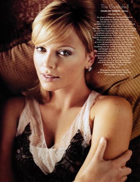 As shape-shifters go, Charlize Theron at first seems an unlikely contender: the blonde, five-foot-ten-inch ex-model/ ex-ballerina’s classic starlet looks have defined most, if not all, of her film roles thus far. But Theron surprised everyone last year by taking on—and then mastering—the role of the real-life prostitute and serial killer Aileen Wuornos in first-time director Patty Jenkins's Monster. Theron’s transformation included not only adopting Wuornos’s physical presence (for Theron, an extra 30 pounds, dentures, contact lenses, no eyebrows, and lank hair) but wading headlong into her world of deepening violence and despair as well, in a performance that earned the actress her first Golden Globe nomination. Next up (and a vacation, by comparison): Head in the Clouds, a romantic drama set in pre-World War II Europe, and the role of actress and second wife Britt Ekland in The Life and Death of Peter Sellers, a biopic of the late actor.