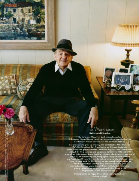 For anyone who grew up knowing him as Detective Mike Stone on TV’s The Streets of San Francisco, or as the sage bystander in the trilby who gravely intoned “American Express—don’t leave home without it,” it's a surprise and a pleasure to learn via VHS and DVD what older folks already know: that Karl Malden, who is now 92, was one of the rocks of midcentury film, bringing his Group Theatre training and “open-hearth face” (his words) to bear on a variety of choice roles. Doing his best work for Elia Kazan, he was marvelously awkward as Mitch in Streetcar, spectacularly dim-witted as the goof who lusts after ripe young Carroll Baker in Baby Doll (1956), and quietly righteous as tough-guy priest Father Barry in the magnificent On the Waterfront (1954).