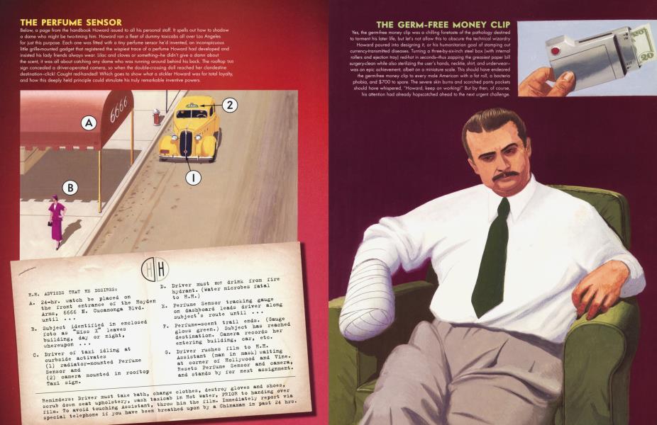 Yes, the germ-free money clip was a chilling foretaste of the pathology destined to torment his later life, but let's not allow this to obscure the technical wizardry Howard poured into designing it, or his humanitarian goal of stamping out currency-transmitted diseases. Turning a three-by-six-inch steel box (with internal rollers and ejection tray) red-hot in seconds-thus zapping the greasiest paper bill surgery-clean while also sterilizing the user's hands, necktie, shirt, and underwear— was an epic achievement, albeit on a miniature scale. This should have endeared the germ-free money clip to every male American with a fat roll, a bacteria phobia, and $700 to spare. The severe skin burns and scorched pants pockets should have whispered, "Howard, keep on working!" But by then, of course, his attention had already hopscotched ahead to the next urgent challenge.