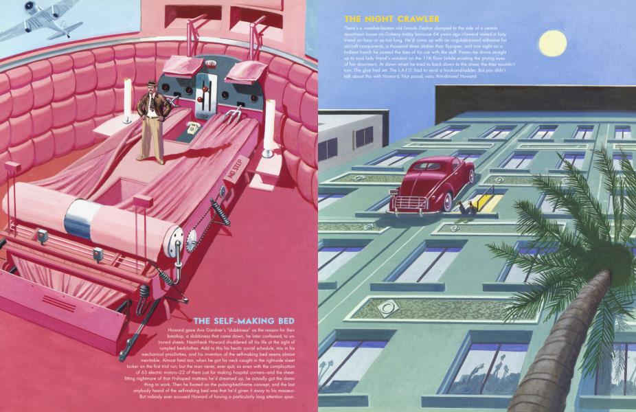 Howard gave Ava Gardner's "slobbiness" as the reason for their breakup, a slobbiness that came down, he later confessed, to un' ironed sheets. Neat-freak Howard shuddered all his life at the sight of rumpled bedclothes. Add to this his hectic social schedule, mix in his mechanical proclivities, and his invention of the self-making bed seems almost inevitable. Almost fatal too, when he got his neck caught in the right-side sheet tucker on the first trial run; but the man never, ever quit, so even with the complication of 63 electric motors—22 of them just for making hospital corners—and the sheet-fitting nightmare of that H-shaped mattress he'd dreamed up, he actually got the damn thing to work. Then he fixated on the pulsing-bed-frame concept, and the last anybody heard of the self-making bed was that he'd given it away to his masseur. But nobody ever accused Howard of having a particularly long attention span.