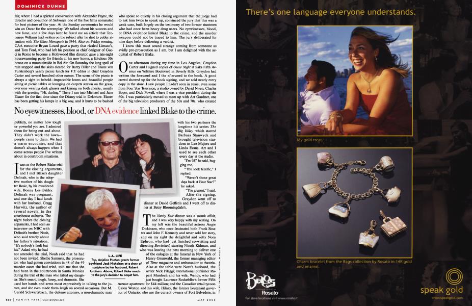 May 2005 Dominick Dunne Larry FinkIf the awards show itself fell flat, the author found plenty of entertainment in Oscar-week L.A. as even Michael Eisner and Liz Taylor made the scene. After V.F.'s epic bash, it was on to a Law & Order surprise, the end of a bitter dispute, and Robert Blake's courtroom stunner