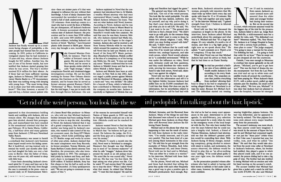 Take General Maximo Overrkill, for instance. That's his soldier of fortune's nom de guerre. His real name is Gordon Novel, and he moves in those spooky circles which he calls "high strange," where conspiracies flourish and cloak-and-dagger investigations overlap. He cut his teeth working for former New Orleans district attorney Jim Garrison on the J.F.K. assassination, and he boasts that he served as former attorney general Ramsey Clark's "Doberman" at Waco. Several weeks before the trial began, I was put in touch with him through Steven Saltzman—the son of a James Bond-film producer—in Monaco, who told me that Michael Jackson's brother Jermaine had been seeking Novel's advice on how to stop the trial. According to Novel, the Jacksons believed that it was all a grand conspiracy, that the accuser's mother was being paid by Jackson's enemies, who wanted to take control of his major economic asset, the Sony/ATV Music catalogue, which holds publishing rights to 251 Beatles songs and works by scores of other pop artists. Jackson claimed that the main conspirators were Sony Records; its former president, Tommy Mottola; and Santa Barbara County district attorney Tom Sneddon, the prosecutor, who also investigated Jackson in 1993. The catalogue is held jointly by Jackson and Sony, and Jackson's share is mortgaged for more than $200 million. If Jackson defaults, Sony has first chance to buy his half as early as this coming December. (A Sony spokesperson said, "We are not going to comment on any aspect of this.")