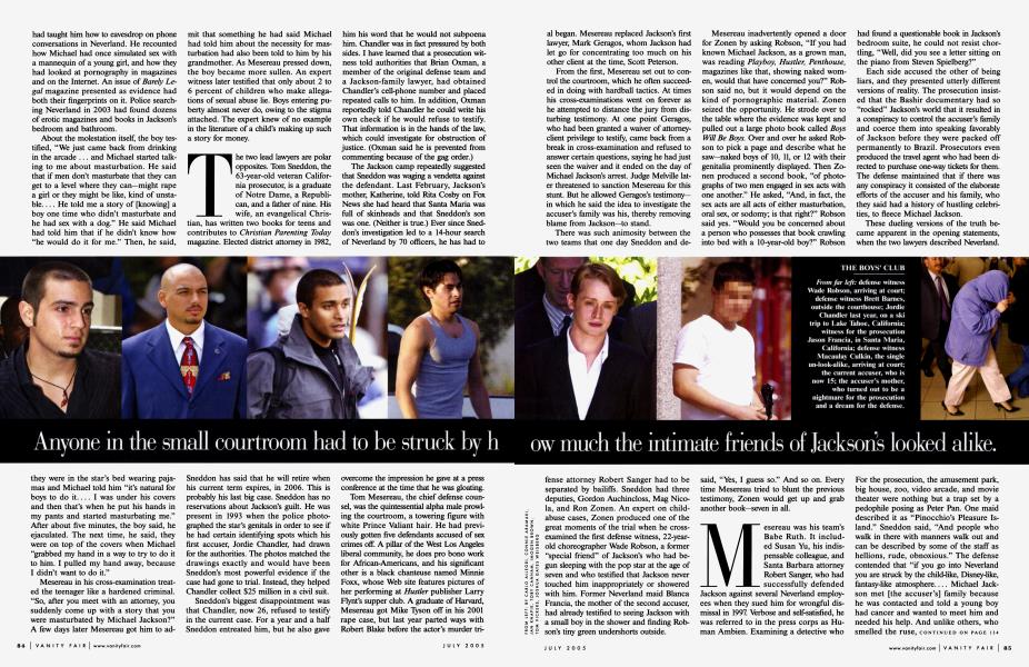 Sneddon's biggest disappointment was that Chandler, now 26, refused to testify in the current case. For a year and a half Sneddon entreated him, but he also gave him his word that he would not subpoena him. Chandler was in fact pressured by both sides. I have learned that a prosecution witness told authorities that Brian Oxman, a member of the original defense team and a Jackson-family lawyer, had obtained Chandler's cell-phone number and placed repeated calls to him. In addition, Oxman reportedly told Chandler he could write his own check if he would refuse to testify. That information is in the hands of the law, which could investigate for obstruction of justice. (Oxman said he is prevented from commenting because of the gag order.)