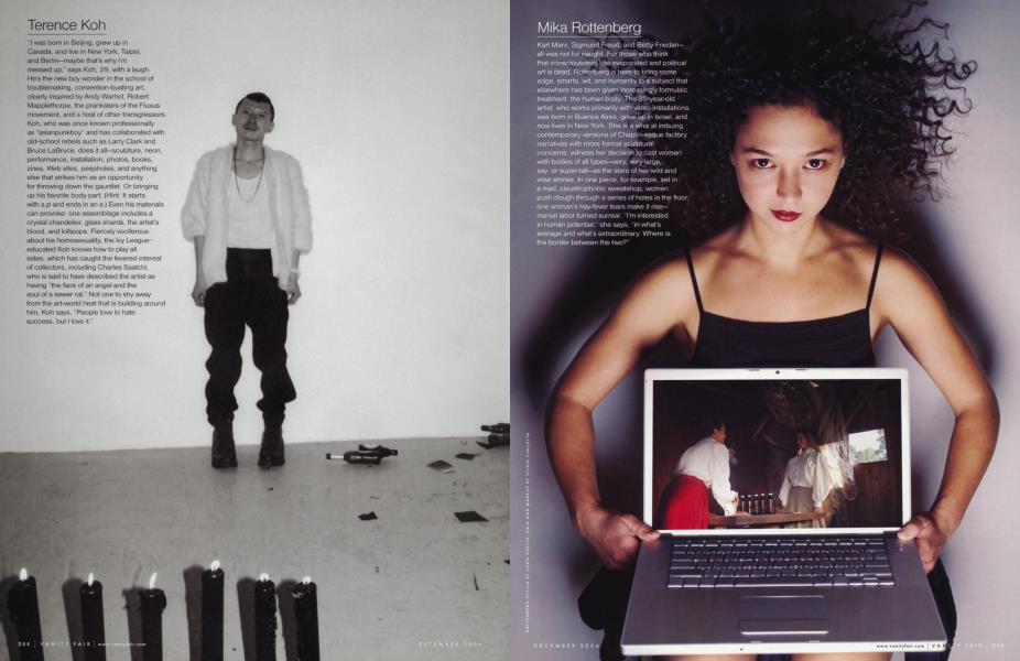 "I was born in Beijing, grew up in Canada, and live in New York, Taipei, and Berlin—maybe that's why I'm messed up," says Koh, 29, with a laugh. He's the new boy wonder in the school of troublemaking, convention-busting art, clearly inspired by Andy Warhol, Robert Mapplethorpe, the pranksters of the Fluxus movement, and a host of other transgressors. Koh, who was once known professionally as 'asianpunkboy" and has collaborated with old-school rebels such as Larry Clark and Bruce LaBruce, does it all—sculpture, neon, performance, installation, photos, books, zines, Web sites, peepholes, and anything else that strikes him as an opportunity for throwing down the gauntlet. Or bringing up his favorite body part. (Hint: It starts with a p and ends in an s.) Even his materials can provoke: one assemblage includes a crystal chandelier, glass shards, the artist's blood, and lollipops. Fiercely vociferous about his homosexuality, the Ivy League-educated Koh knows how to play all sides, which has caught the fevered interest of collectors, including Charles Saatchi, who is said to have described the artist as having "the face of an angel and the soul of a sewer rat." Not one to shy away from the art-world heat that is building around him, Koh says, "People love to hate success, but I love it."
