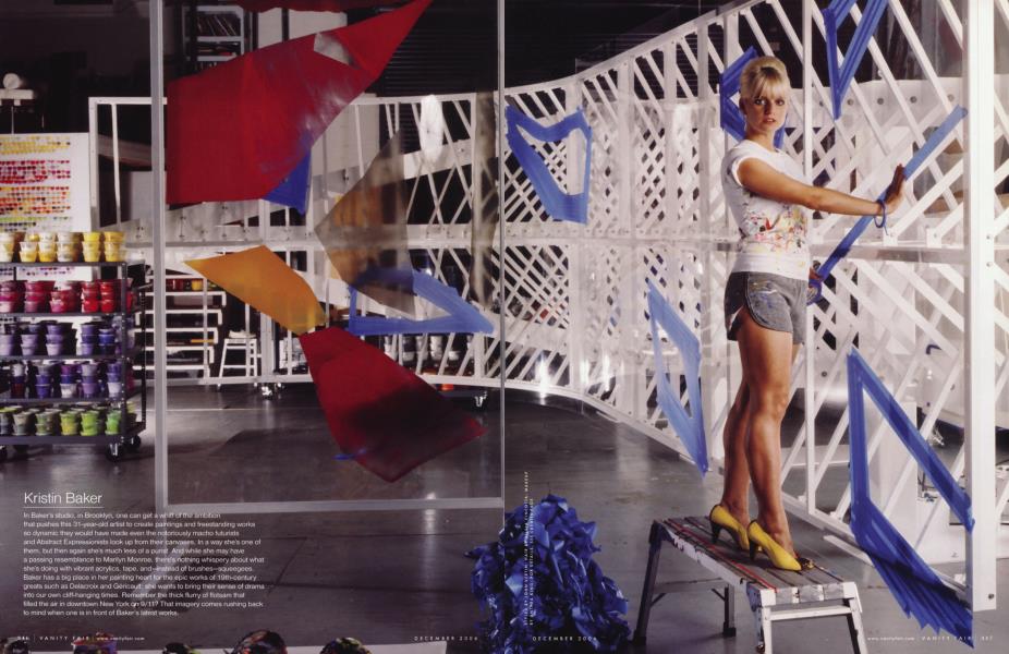 In Bakers studio, in Brooklyn, one can get a whiff of the ambition that pushes this 31-year-old artist to create paintings and freestanding works so dynamic they would have made even the notoriously macho futurists and Abstract Expressionists look up from their canvases. In a way she's one of them, but then again she's much less of a purist. And while she may have a passing resemblance to Marilyn Monroe, there's nothing whispery about what she's doing with vibrant acrylics, tape, and—instead of brushes—squeegees. Baker has a big place in her painting heart for the epic works of 19th-century greats such as Delacroix and Géricault; she wants to bring their sense of drama into our own cliff-hanging times. Remember the thick flurry of flotsam that filled the air in downtown New York on 9/11? That imagery comes rushing back to mind when one is in front of Baker's latest works.