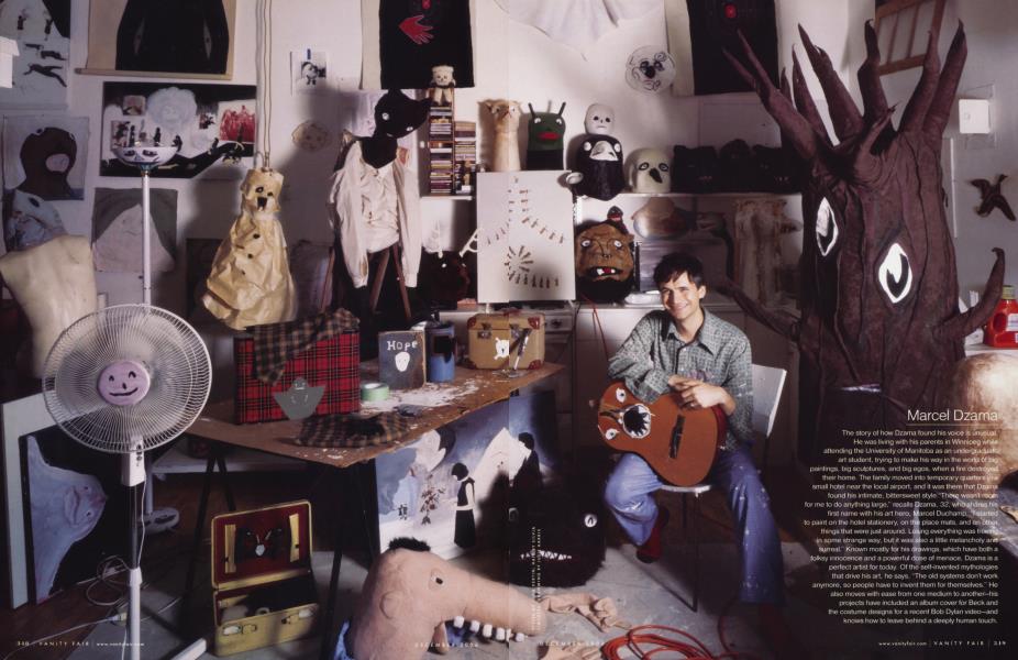 The story of how Dzama found his voice is unusual. He was living with his parents in Winnipeg while attending the University of Manitoba as an undergraduate art student, trying to make his way in the world of big paintings, big sculptures, and big egos, when a fire destroyed their home. The family moved into temporary quarters in a small hotel near the local airport, and it was there that Dzama found his intimate, bittersweet style. "There wasn't room for me to do anything large," recalls Dzama, 32, who shares his first name with his art hero, Marcel Duchamp. "I started to paint on the hotel stationery, on the place mats, and on things that were just around. Losing everything was freeing in some strange way, but it was also a little melancholy and surreal." Known mostly for his drawings, which have both a folksy innocence and a powerful dose of menace, Dzama is a perfect artist for today. Of the self-invented mythologies that drive his art, he says, "The old systems don't work anymore, so people have to invent them for themselves." He also moves with ease from one medium to another—his projects have included an album cover for Beck and the costume designs for a recent Bob Dylan video—and knows how to leave behind a deeply human touch.