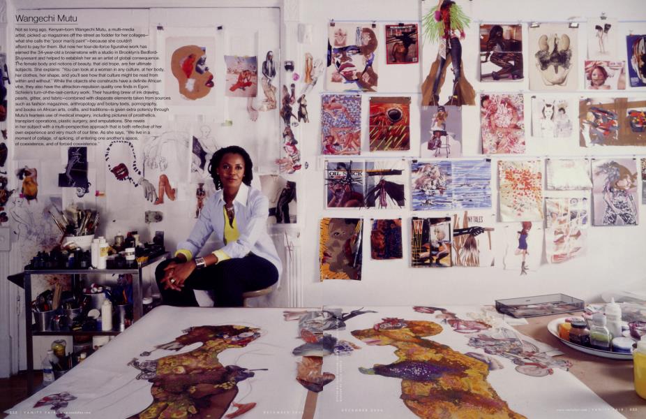 Not so long ago, Kenyan-born Wangechi Mutu, a multi-media artist, picked up magazines off the street as fodder for her collages— what she calls the "poor man's paint"—because she couldn't afford to pay for them. But now her tour-de-force figurative work has earned the 34-year-old a brownstone with a studio in Brooklyn's BedfordStuyvesant and helped to establish her as an artist of global consequence. The female body and notions of beauty, that old trope, are her ultimate subjects. She explains: "You can look at a woman in any culture, at her body, her clothes, her shape, and you'll see how that culture might be read from within and without." While the objects she constructs have a definite African vibe, they also have the attraction-repulsion quality one finds in Egon Schiele's turn-of-the-last-century work. Their haunting brew of ink drawing, pearls, glitter, and fabric—combined with disparate elements taken from sources such as fashion magazines, anthropology and botany texts, pornography, and books on African arts, crafts, and traditions—is given extra potency through Mutu's fearless use of medical imagery, including pictures of prosthetics, transplant operations, plastic surgery, and amputations. She revels in her subject with a multi-perspective approach that is both reflective of her own experience and very much of our time. As she says, "We live in a moment of collage, of splicing, of entering one another's space, of coexistence, and of forced coexistence."
