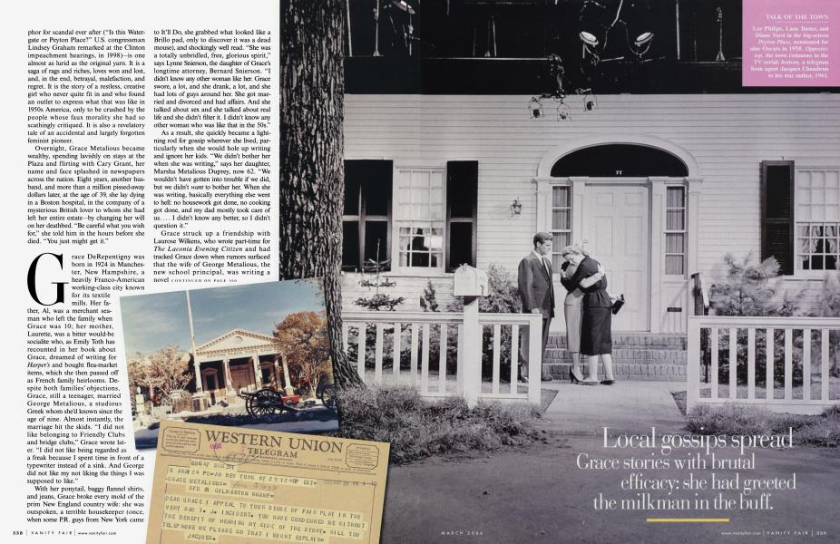 Grace DeRepentigny was born in 1924 in Manchester, New Hampshire, a heavily Franco-American working-class city known for its textile mills. Her father, Al, was a merchant seaman who left the family when Grace was 10; her mother, Laurette, was a bitter would-be socialite who, as Emily Toth has recounted in her book about Grace, dreamed of writing for Harper's and bought flea-market items, which she then passed off as French family heirlooms. Despite both families' objections. Grace, still a teenager, married George Metalious, a studious Greek whom she'd known since the age of nine. Almost instantly, the marriage hit the skids. "I did not like belonging to Friendly Clubs and bridge clubs," Grace wrote later. "I did not like being regarded as a freak because I spent time in front of a typewriter instead of a sink. And George did not like my not liking the things I was supposed to like."