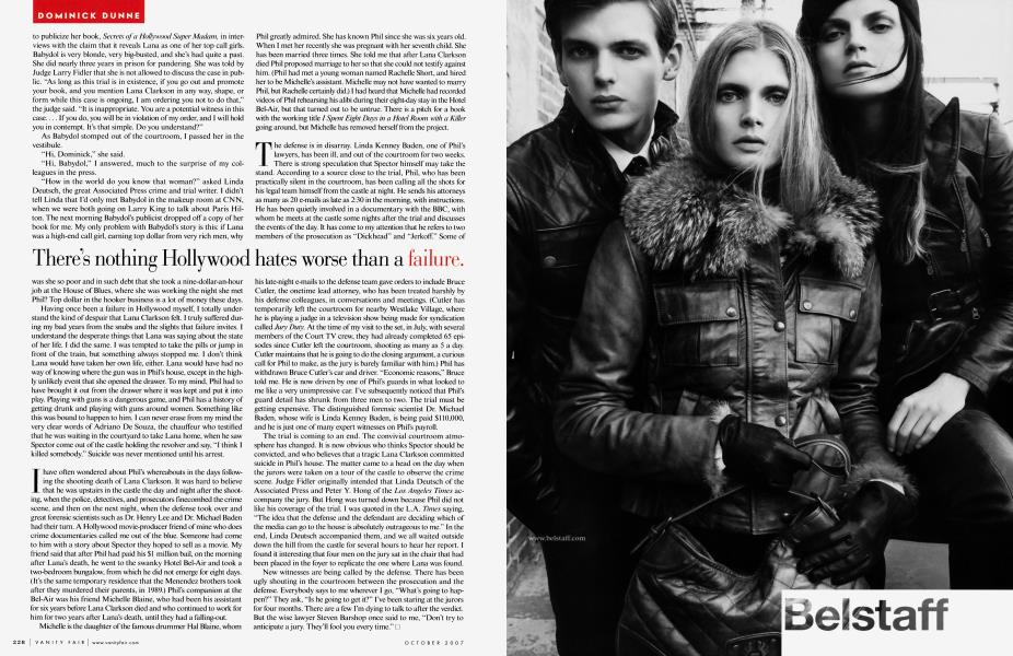 October 2007 Dominick DunnePhil Spector has stopped speaking to me when we pass in the corridors of the Clara Shortridge Foltz Criminal Justice Center, in downtown Los Angeles, where he is standing trial for the murder of Lana Clarkson. No more nods of greeting or occasional handshakes. Rachelle, his pretty young wife, has adopted a snippy attitude when I run into her outside the courtroom. His chief bodyguard, Horace Davis, and the two deputies are no longer jolly when we meet. I suppose my having lunch with Spector’s son Louis and Louis’s girlfriend, Frieda, in the courthouse commissary on quite a few occasions may have annoyed Phil. One of Phil’s guards has told Louis that his father would speak to him more if he didn’t talk to the media. Louis does not ever speak badly about his father, although his stories of growing up as Spector’s son, locked in a separate room from his twin, Gary, in the afternoons after school, have a sort of Hollywood-Dickensian ring to them. Maybe Phil has discovered that I am not rooting for him to win an acquittal, although I maintain an affection for him. We’re not friends, but we’ve known each other for 20 years, more or less. As I’ve said before, Phil Spector is a fascinating character, and he possessed a great talent. I have been listening to his Wall of Sound music of late, and it’s really something. It’s a very peculiar position to be in, knowing personally the defendant in a murder trial about which I am writing, especially when I am publicly a victims’ advocate. My sympathies in this case are with Lana Clarkson, who was found shot dead in the foyer of Phil’s castle in Alhambra, California, on February 3, 2003. She is being trashed by the defense, despite their public avowals that they would not do so. Expert witnesses, who are sometimes called “whores of the court” (one of whom makes $5,000 a day), look the jurors in the face and give them scientific forensic “proof” that Lana committed suicide.