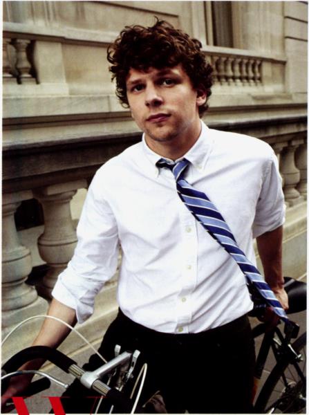 Jesse Eisenberg in New York City. wearing a shirt by Tommy Hilfiger and pants and a lie by Polo Ralph Lauren.