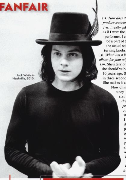 j.w. I don't feel musical divisions as much as when I was in the thick of the garage-rock scene. Everyone is a performer; I understand their point of view better than when I was younger. It's all music—we're all in a family together. L.R. How did the collaboration with Wanda Jackson come about? j.w. She wanted me to sing with her on a record where every song is another collaboration. I don't really care for those [kinds of] records, so I asked if we could change it up and would she come do a single with Third Man. It turned into a whole album very quickly—I can't wait for it to be released.