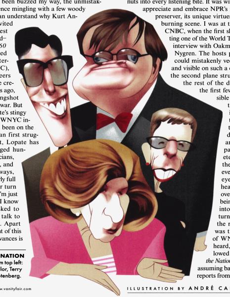I hear a grudge against National Public Radio, a grudge that has grown over the years into quite a bitter lad. Precariously propping up the collective I.Q. of the country with reliable reporting, wry commentary, and whimsical humor (which can really get on your nerves if you're not in the mood), NPR may be a beloved institution to millions of listeners, a lighthouse of searching calm in a sea of crazy, a warm companion on a rainy day—but not to me. Personally, professionally, NPR has never done me a lick of good. I've brought out a novel and a book about the media, and with both NPR shut the chapel door in my face, while just about every other writer I know has gotten their ego scalp-massaged, with ample opportunity to recount the "genesis" of their latest work without the interviewer's eyes wandering all over the racetrack. "This is Fresh Air. I'm Terry Gross." Fresh air, how sweet it must taste. Stale rejection straight from the aerosol can is what's been buzzed my way, the unmistakable scent of indifference mingling with a few woody notes of "scram." 1 can understand why Kurt Andersen has never invited me aboard as a guest for his Peabody Award-winning Studio 360 program (co-produced by Public Radio International and WNYC), which each week peers under the hood of the creative mind: a few years ago, he and I traded slingshot pebbles over the Iraq war. But what's Leonard Lopate's stingy excuse? The host of a WNYC interview show that has been on the air since unibrow man first struggled to walk upright, Lopate has knowledgeably engaged hundreds of writers, musicians, journalists, architects, and distinguished stowaways, his greenroom regularly full of guests waiting their turn for flu shots, and yet I'm just about the only writer I know who's never been asked to lay down a little hep talk to all those square cats. Apart from venting, the point of this Festivus litany of grievances is to say that, despite all the nothing NPR has done for me, I still donate money to it! They ask and I give. Which makes me a masochist, a patsy, or a true liberal, which in many people's minds are interchangeable terms—redundancies. And I barely listen to NPR when I'm in New York, finding it too laxative, too self-effacing.