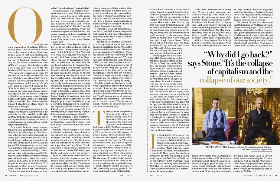 April 2010 Michael Lewis Annie LeibovitzOliver Stone's 1987 Wall Street succeeded brilliantly in capturing a culture, and failed miserably as a call for change. To the director’s dismay, thousands of financial hotshots dreamed of becoming Gordon Gekko—and the rest is recent history. Anticipating the sequel, Wall Street: Money Never Sleeps, MICHAEL LEWIS looks at Stone’s greatest challenge: creating a hero for a corrupted, collapsing world