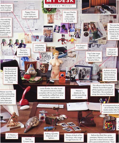 Betty Draper at her drunkest and toughest. The chip-and-dip was a wedding gift of Pete and Trudy Campbell's in Season One. Originally it was a wedding gift of his parents'. Peggy Olson in her first nonvirgin nightgown. His son Charlie did these crazy crabs in the style of R. Crumb. This was the first of many articles to misidentify David Chase as the creator of Mad Men. A bust of Ludwig van Beethoven. Fog Cutter mugs from the old Trader Vic's in the Beverly Hilton. Don Draper's Cadillac. A birthday card from his son Marten. The BAFTA Mad Men won in 2009. He discovered this Ericofon at the Rose Bowl swap meet. He thought it was rare. Turns out it's not. Weiner won the award for outstanding international producer at the Monte Carlo Television Festival last year. Linda Brettler, his wife, found this period anatomy model, complete with too much makeup and perfectly coiffed hair, at a teachers' supply store. Weiner's datebook. He prefers everything on paper. A photo of Jack Lemmon during the Christmasparty scene in The Apartment. This album is the first thing Weiner found that ripped off the typeface and look of Mad Men. He considered suing, but was too flattered. A commemorative pen set of Dealey Plaza made weeks after the assassination of J.F.K. His favorite snack is plain M&M's. Before the Mad Men series premiere, Weiner's son Marten gave him a silver fortune cookie with a personalized fortune: "Your dreams for work will go higher than expectation could be." Photos of each of his four boys, who range in age from 6 to 13. Rolling cigarette dispenser and lighters. Sterling Cooper's top client: Lucky Strike. A Tibetan prayer horn.