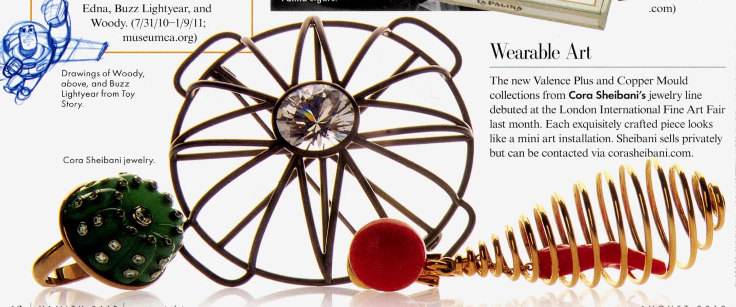 The new Valence Plus and Copper Mould collections from Cora Sheibani's jewelry line debuted at the London International Fine Art Fair last month. Each exquisitely crafted piece looks like a mini art installation. Sheibani sells privately but can be contacted via corasheibani.com.