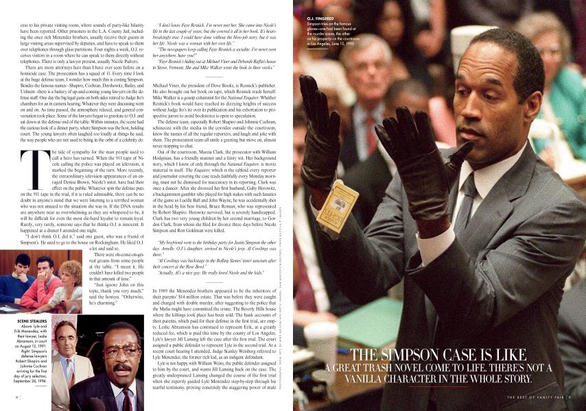 The Simpson case is like a great trash novel come to life, a mammoth fireworks display of interracial marriage, love, lust, lies, hate, fame, wealth, beauty, obsession, spousal abuse, stalking, brokenhearted children, the bloodiest of bloody knife-slashing homicides, and all the justice that money can buy. With Kato Kaelin, Al Cowlings, Faye Resnick, Denise Brown, and Detective Mark Fuhrman in key supporting roles, there's not a vanilla character in the whole story. Even the lawyers on both sides are bigger than life. By now, who doesn't know who Robert Shapiro and Johnnie Cochran Jr. are? Or Marcia Clark? At dinner parties and in restaurants, whole evenings are spent discussing the case. Everyone has a tidbit of information. Everyone has a theory about what happened. Even those people who affect weariness with the subject, who say things like "I'm sick, sick, sick to death of O.J.," lean in and listen intently when a new nugget is brought forth. A great many people I have encountered were friends, or friends of friends, of O.J.'s or Nicole's before the knifings. Everyone has a topper to everyone else's piece of information. "I saw Nicole jogging in Brentwood just the day before," said a man at a screening, to which another man immediately replied, "Craig Baumgarten played golf with O.J. that Sunday morning at Riviera."