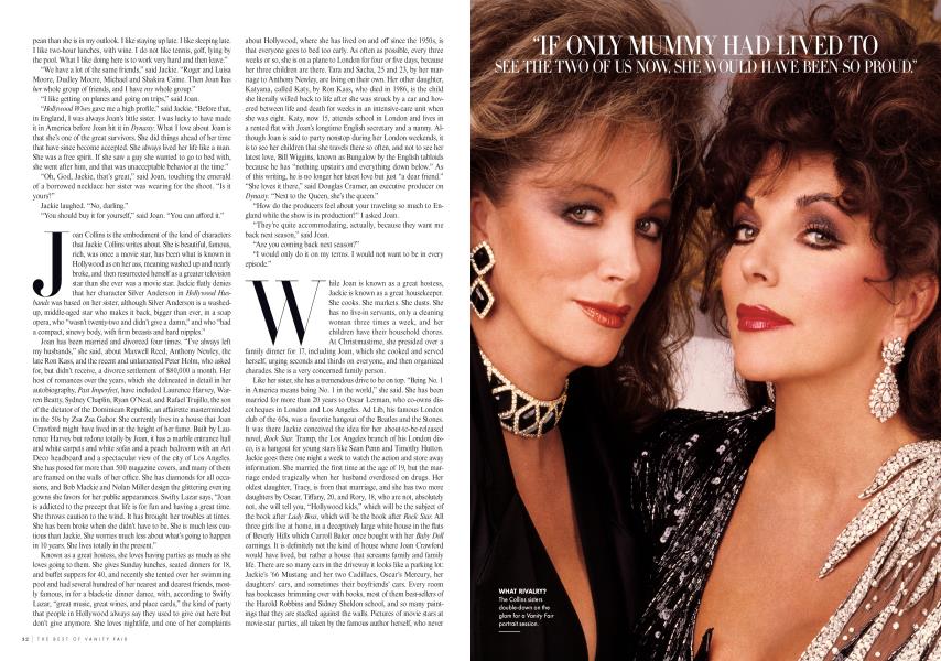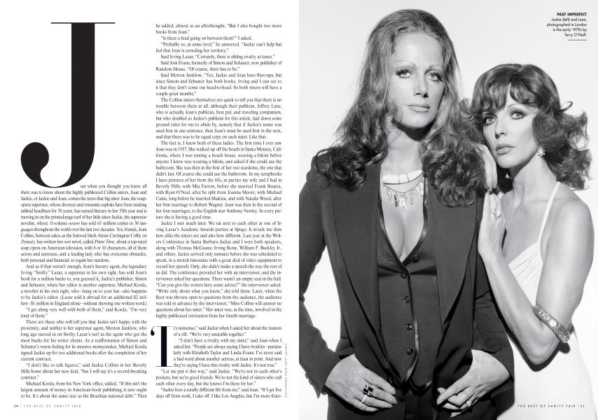 Sign In Not a Subscriber?Join NowHollywood sisters Jackie and Joan Collins are the ultimate triumph of the immigrant. Landing from London, they carved out separate kingdoms of glitz and glamour: best-selling author Jackie was the Queen of Dish, and Dynasty star Joan was the Queen of Soap. Then Soap dished, with a 1988 debut novel, Prime Time. The late DOMINICK DUNNE found the two of them denying all reports of a rivalry, literary or otherwise, while the publishing world prepared for a smackdown