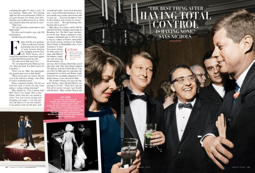January 2013 Sam KashnerTwo months after Mike Nichols and Elaine May arrived in New York, in 1957, their improv act was the toast of the town. Four smash-hit years later, nationally famous, they simply stopped. Half a century has passed, but as SAM KASHNER discovers, in an unprecedented joint interview, the celebrated director and screenwriter still crack each other up