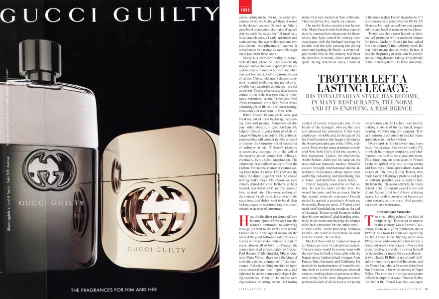 Overboard as his behavior may have been, Trotter paved the way for reality TV, in which hair-trigger eruptions and chef-imposed meltdowns are a gladiator sport. This abuse, long an open secret in French kitchens, spilled over into dining rooms and became a blood sport diners wanted a taste of. The irony is that Trotter, who made Gordon Ramsay's profane and public tantrums possible, was too early to benefit from the television celebrity he likely craved. (The restaurant closed at the end of last August.) But he did leave a lasting legacy: his totalitarian style has become, in many restaurants, the norm. And recently it is enjoying a resurgence.