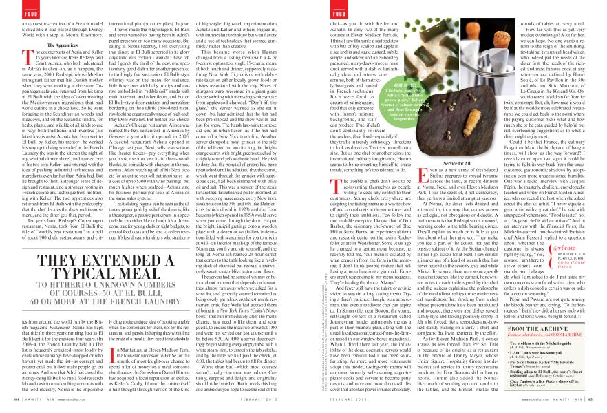 The most telling echo of the kind of rampant ego Trotter set in motion in this country was a framed Catalonian menu in a guest bathroom dated 1998: it was from El Bulli and signed by its chef, Ferran Adria. Starting in the mid1990s, every ambitious diner had to take a plane and snare a reservation—often in that order, the bleary traveler throwing himself on the maitre d's mercy for a cancellation— at two places: El Bulli, a notoriously difficult two-hour drive north of Barcelona, and the French Laundry, a far easier drive from San Francisco to the wine country of Napa Valley. The cuisines at the two restaurants differed in important ways. Thomas Keller, the chef at the French Laundry, was rigorously trained in French technique and incorporated the best of California's artisan food producers into his heavily French, generally heavy (because butter-laden) dishes. Ferran Adria began as a cook of relatively rustic Catalonian cuisine. But he started experimenting with new techniques and processes that had been the province of the food industry, creating disorienting novelties that acquired a name that he never liked but will forever be associated with: "molecular gastronomy." Adria wrested the crown of the world's most influential cuisine away from the French and became the chef ambitious cooks had to work for—even knowing that they would be treated like slaves by an exploitative overseer, as Lisa Abend documents in her entertaining book, The Sorcerer's Apprentices.