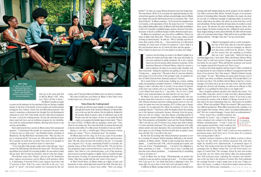 At West Fourth Street, de Blasio strides up a flight of stairs and boards the A train, which takes him toward City Hall. This time he is noticed and consents to a dozen more selfies. "How you doing, brother?" he asks one young African-American man who hangs back. The man beams. Of the 25 or so people who approach during our ride, at least three-quarters are black, perhaps unsurprisingly, since de Blasio has a black wife and his Yale-bound son has an enormous Afro. "And then Ed Koch," de Blasio continues, "he borrowed the template from La Guardia, a real expectation of how the mayor has to be." I remark that, political philosophies aside, de Blasio's style bears little resemblance to that of La Guardia (a publicity-hungry dynamo obsessed with infrastructure) or Koch (a publicity-hungry lovable obnoxious-uncle type).