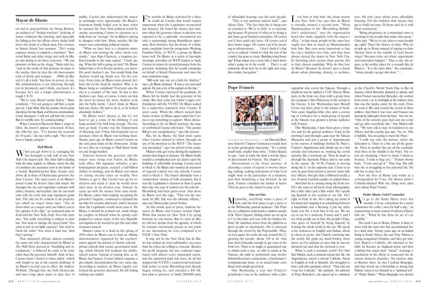 As this article goes to press, relations between de Blasio and Cuomo remain frigid. What that means for New York City going forward, no one knows. But it's clear de Blasio will not deviate from his agenda, of which he remains enormously proud; at one point in our discussions he even compared it to F.D.R.'s New Deal.