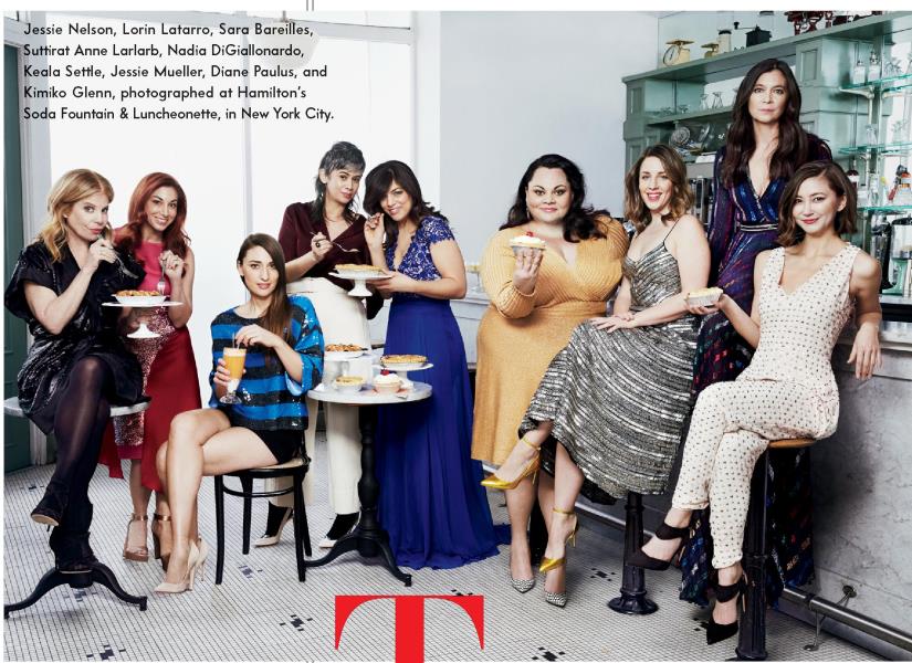 Jessie Nelson, Lorin Latarro, Sara Bareilles, Suttirat Anne Larlarb, Nadia DiGiallonardo, Keala Settle, Jessie Mueller, Diane Paulus, and Kimiko Glenn, photographed at Hamilton's Soda Fountain & Luncheonette, in New York City.