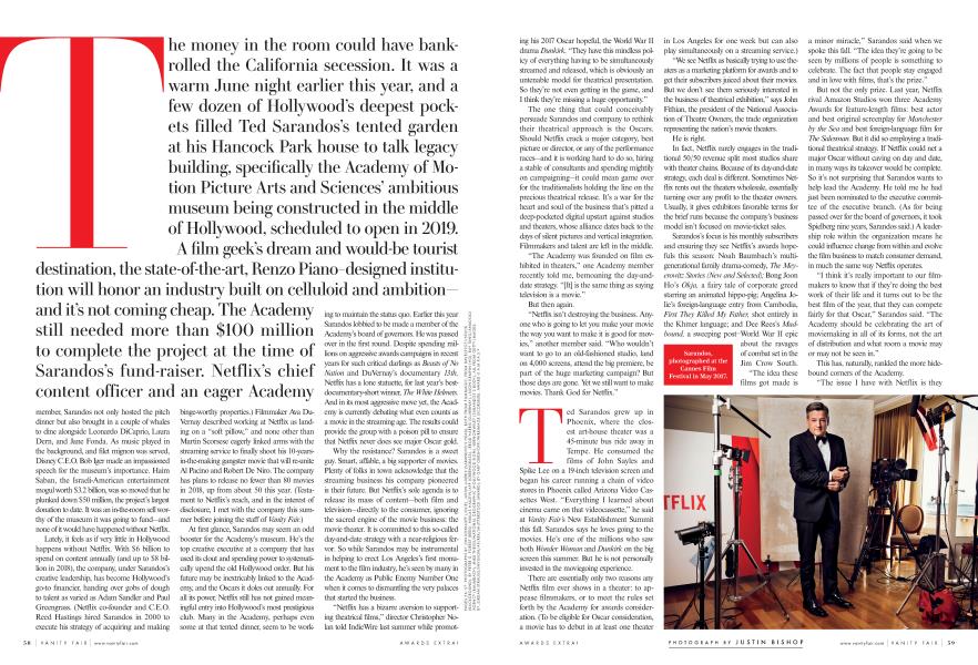 The money in the room could have bankrolled the California secession. It was a warm June night earlier this year, and a few dozen of Hollywood’s deepest pockets filled Ted Sarandos’s tented garden at his Hancock Park house to talk legacy building, specifically the Academy of Motion Picture Arts and Sciences’ ambitious museum being constructed in the middle of Hollywood, scheduled to open in 2019. A film geek’s dream and would-be tourist destination, the state-of-the-art, Renzo Piano-designed institution will honor an industry built on celluloid and ambition—and it’s not coming cheap. The Academy still needed more than $100 million to complete the project at the time of Sarandos’s fund-raiser. Netflix’s chief content officer and an eager Academy member, Sarandos not only hosted the pitch dinner but also brought in a couple of whales to dine alongside Leonardo DiCaprio, Laura Dern, and Jane Fonda. As music played in the background, and filet mignon was served, Disney C.E.O. Bob Iger made an impassioned speech for the museum’s importance. Haim Saban, the Israeli-American entertainment mogul worth $3.2 billion, was so moved that he plunked down $50 million, the project’s largest donation to date. It was an in-the-room sell worthy of the museum it was going to fund—and none of it would have happened without Netflix.