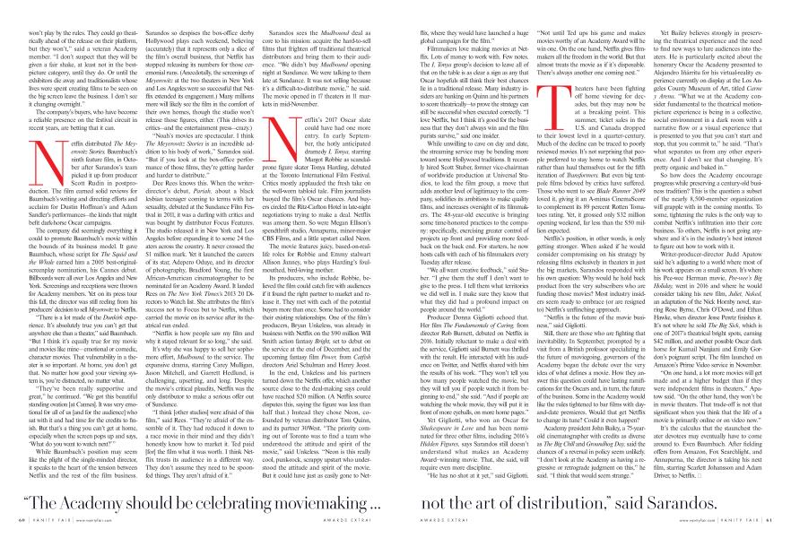 Netflix distributed The Meyerowitz Stories, Baumbach’s ninth feature film, in October after Sarandos’s team picked it up from producer Scott Rudin in postproduction. The film earned solid reviews for Baumbach’s writing and directing efforts and acclaim for Dustin Hoffman’s and Adam Sandler’s performances—the kinds that might befit dark-horse Oscar campaigns.