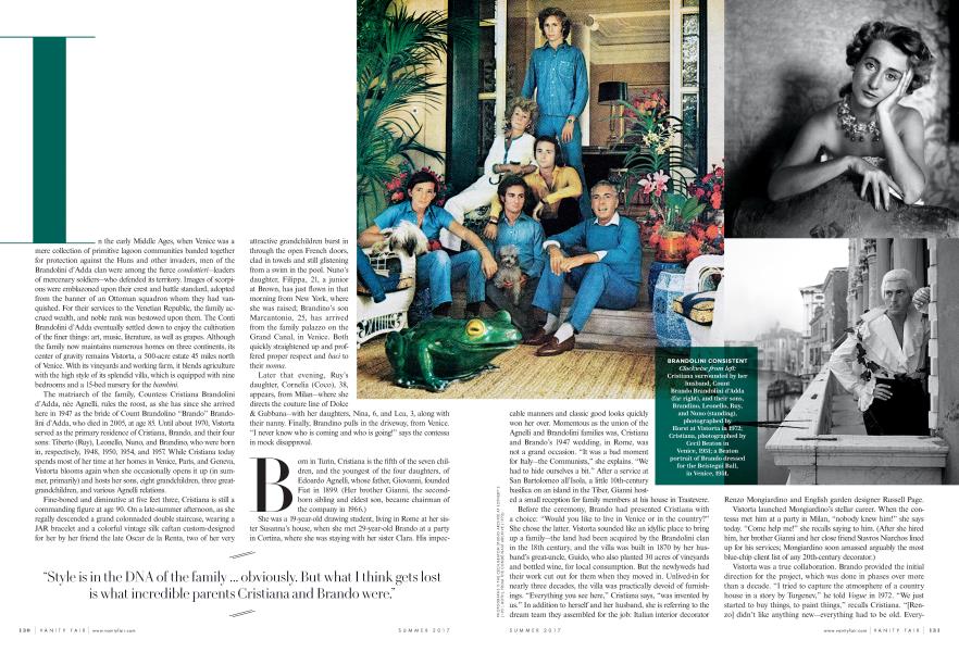 Summer 2017 James ReginatoUniting two of Italy's most famous bloodlines, Countess Cristiana Brandolini d'Adda, née Agnelli, has long been celebrated for her style, so evident in her homes in Venice, Paris, and Geneva. But at Vistorta, the 500-acre Brandolini country estate and vineyard, JAMES REGINATO discovers the 90-year-old matriarch's greatest achievement: a thriving, tight-knit family that cares more about the present—and a fine wine—than its illustrious past