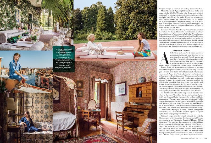 Unlike many of their ilk, the Brandolinis weren't just about good taste. "Style is in the DNA of the family... obviously," says photographer Priscilla Rattazzi about her aunt, late uncle, and cousins. "Yes, V I the palaces and the houses are gorgeous. But what I think gets lost is what incredible parents Cristiana and Brando were. They raised four fantastic boys. They have always all been very close, which is really touching to see. They are the sanest of my big whole family. It doesn't exactly run in the family. There is quite a bit of dysfunction in that department."