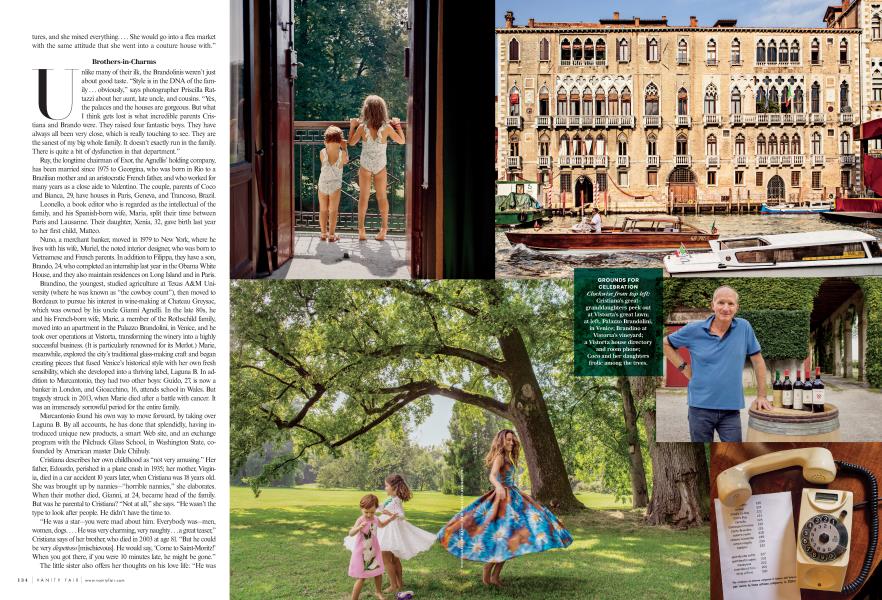 Brandino, the youngest, studied agriculture at Texas A&M University (where he was known as "the cowboy count"), then moved to Bordeaux to pursue his interest in wine-making at Chateau Greysac, which was owned by his uncle Gianni Agnelli. In the late 80s, he and his French-born wife, Marie, a member of the Rothschild family, moved into an apartment in the Palazzo Brandolini, in Venice, and he took over operations at Vistorta, transforming the winery into a highly successful business. (It is particularly renowned for its Merlot.) Marie, meanwhile, explored the city's traditional glass-making craft and began creating pieces that fused Venice's historical style with her own fresh sensibility, which she developed into a thriving label, Laguna B. In addition to Marcantonio, they had two other boys: Guido, 27, is now a banker in London, and Gioacchino, 16, attends school in Wales. But tragedy struck in 2013, when Marie died after a battle with cancer. It was an immensely sorrowful period for the entire family.