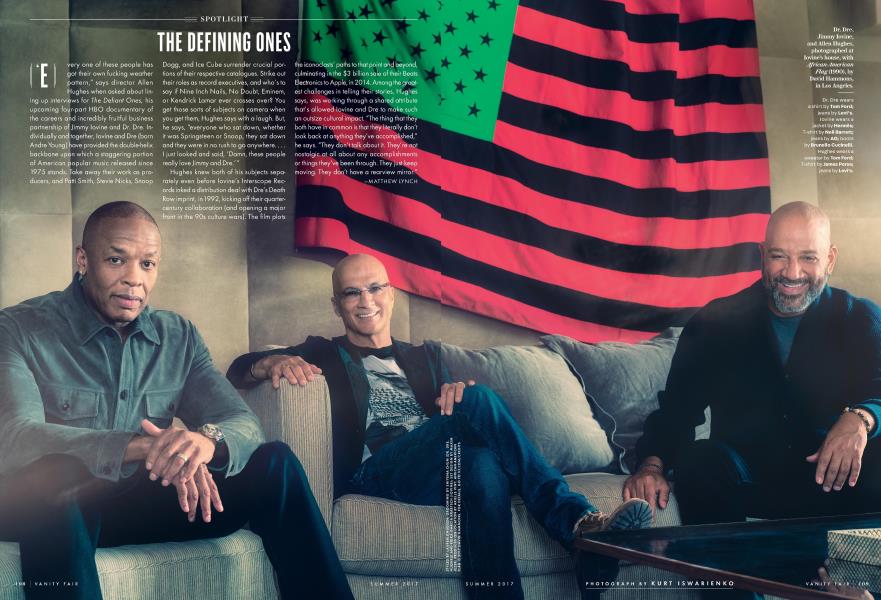 Summer 2017 Matthew Lynch"Everyone of these people has got their own fucking weather pattern," says director Allen Hughes when asked about lining up interviews for The Defiant Ones, his upcoming four-part HBO documentary of the careers and incredibly fruitful business partnership of Jimmy lovine and Dr. Dre.
