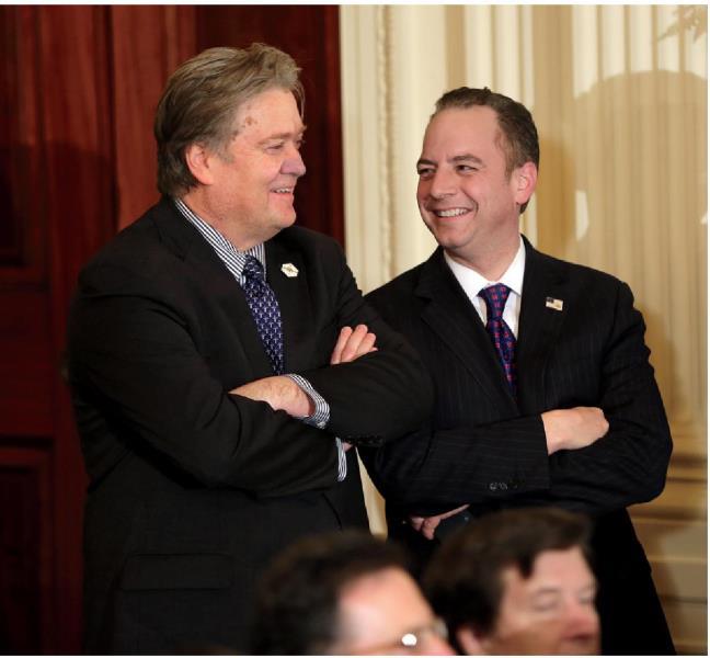 As it turned out, there was a moment on Election Night when it looked as though the chief's job might go to Bannon, who eventually became Priebus's ally in the West Wing. (Others would be considered as well.) But he didn't look the part. "Trump looked around and I remember I had a combat jacket on and I hadn't shaved in a week," said Bannon, who spoke with me at length just before the release of Fire and Fury. "I had the greasy hair [hanging] down.... I'm the senior guy—but look, it was obvious Reince had to be chief of staff." Priebus, however, would be chief in name only: Trump, instead, anointed Bannon as Priebus's coequal, with Bannon, Trump's chief strategist, getting top billing.