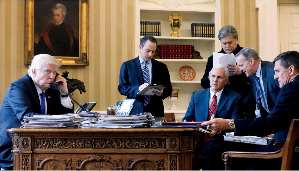 Trump, Priebus, Vice President Mike Pence, Bannon, onetime communications director Sean Spicer, and embattled national-security adviser Michael Flynn