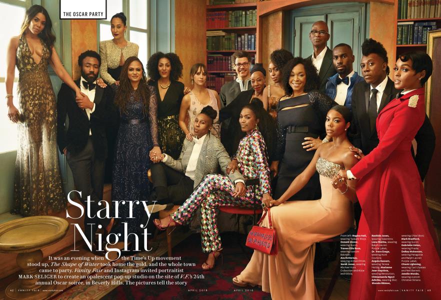 From left: Regina Hall, wearing Tadashi Shoji; Donald Glover, wearing Gucci; Tracee Ellis Ross, wearing custom Balmain; Ava DuVernay, wearing Armani Privé; Sarah Jones, wearing Michael Kors Collection and Alice and Olivia; Rashida Jones, wearing Valentino; Lena Waithe, wearing Ralph Lauren Purple Label; Dr. Ivara Esege, wearing Hunt Couture; Angela Bassett, wearing Teresa Helbig; Marianne Jean-Baptiste, wearing Revolution; Chimamanda Ngozi Adichie, wearing Dior; Shonda Rhimes, wearing Chiari Boni; Mark Bradford, wearing Gucci; Gabrielle Union, wearing Prada; DeRay Mckesson, wearing Patagonia and Ralph Lauren Purple Label; Chuck Lightning, wearing Carl Ulysses and Neil Barrett; Janelle Monáe, wearing custom Christian Siriano.