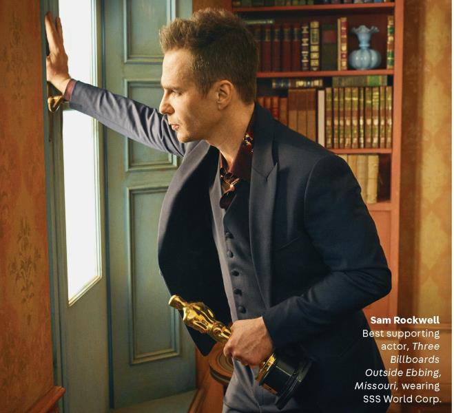 Sam Rockwell Best supporting actor, Three Billboards Outside Ebbing, Missouri, wearing SSS World Corp.