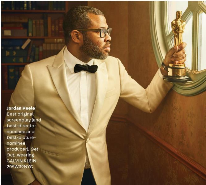 Jordan Peele Best original screenplay (and best-director nominee and best-picture-nominee producer). Get Out, wearing CALVIN KLEIN.