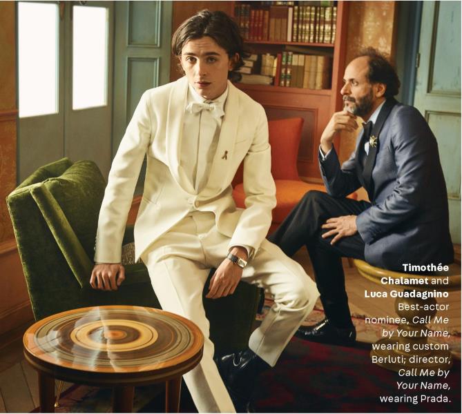Timothée Chalamet and Luca Guadagnino Best-actor nominee, Call Me by Your Name, wearing custom Berluti; director. Call Me by Your Name, wearing Prada.