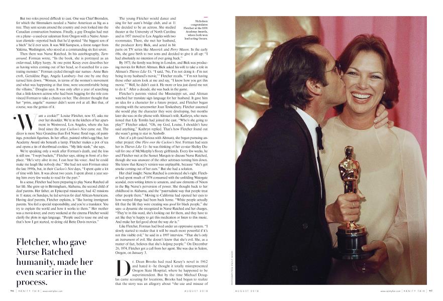 August 2018 Michael SchulmanAs Nurse Ratched in One Flew over the Cuckoo's Nest, Louise Fletcher created an archetypal female villain. With Ryan Murphy's forthcoming series set to carve out her character's backstory, Fletcher reveals the method behind her quietly monstrous anti-heroine