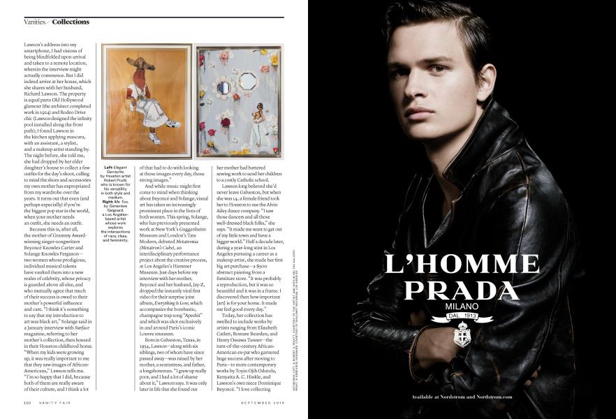 Because this is, after all, the mother of Grammy Award-winning singer-songwriters Beyoncé Knowles Carter and Solange Knowles Ferguson—two women whose prodigious, individual musical talents have vaulted them into a new realm of celebrity, whose privacy is guarded above all else, and who mutually agree that much of their success is owed to their mother's powerful influence and care. "I think it's something to say that my introduction to art was black art," Solange said in a January interview with Surface magazine, referring to her mother's collection, then housed in their Houston childhood home. "When my kids were growing up, it was really important to me that they saw images of African-Americans," Lawson tells me. "I'm so happy that I did, because both of them are really aware of their culture, and I think a lot of that had to do with looking at those images every day, those strong images."