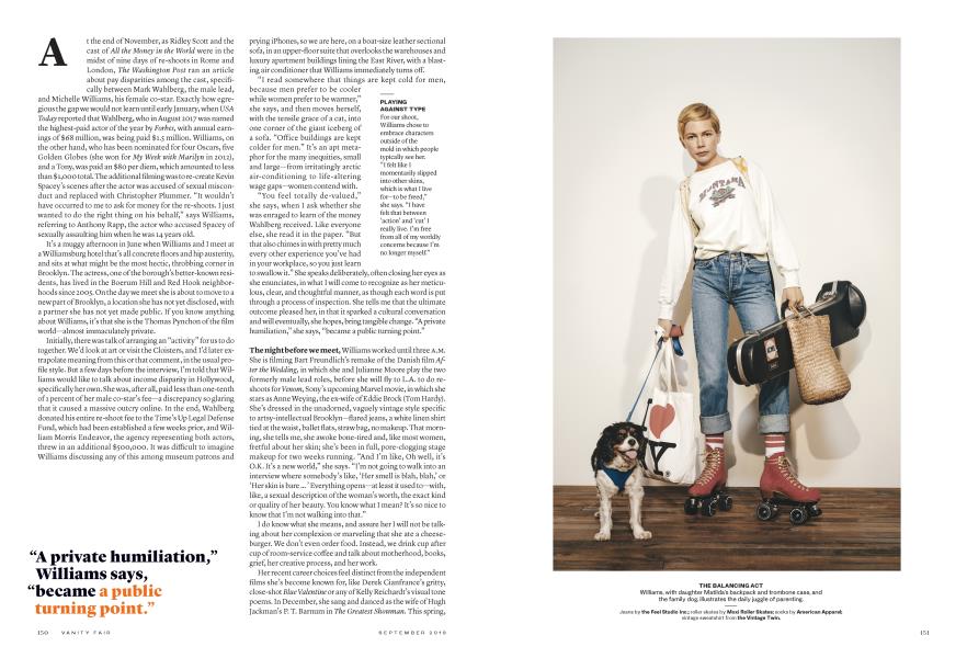 September 2018 Amanda Fortini Collier Schorr Samira NasrAt the end of November, as Ridley Scott and the cast of All the Money in the World were in the midst of nine days of re-shoots in Rome and London, The Washington Post ran an article about pay disparities among the cast, specifically between Mark Wahlberg, the male lead, and Michelle Williams, his female co-star. Exactly how egregious the gap we would not learn until early January, when USA Today reported that Wahlberg, who in August 2017 was named the highest-paid actor of the year by Forbes, with annual earnings of $68 million, was being paid $1.5 million. Williams, on the other hand, who has been nominated for four Oscars, five Golden Globes (she won for My Week with Marilyn in 2012), and a Tony, was paid an $80 per diem, which amounted to less than $1,000 total. The additional filming was to re-create Kevin Spacey's scenes after the actor was accused of sexual misconduct and replaced with Christopher Plummer. "It wouldn't have occurred to me to ask for money for the re-shoots. I just wanted to do the right thing on his behalf," says Williams, referring to Anthony Rapp, the actor who accused Spacey of sexually assaulting him when he was 14 years old.
